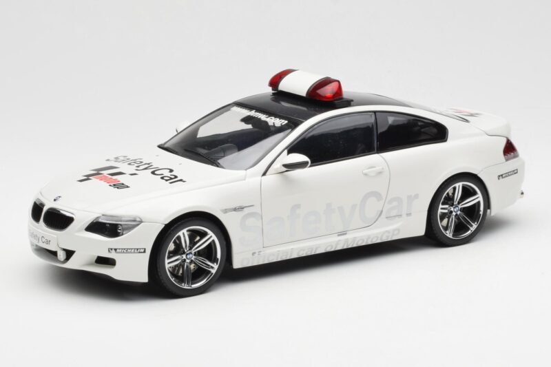 The BMW M6 E63 MotoGP Safety Car 2006 Kyosho 1:18 is crafted from Kov. Die-cast zinc alloy body with detailed plastic parts, rubber tires, and high-quality paint finish. Die-cast models are known for their weight, durability, and realistic feel.