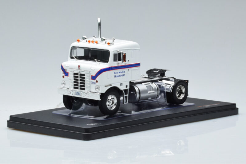 The Kenworth Bullnose Ross Mackie Transport Bílý IXO 1:43 is crafted from Kov. Die-cast zinc alloy body with detailed plastic parts, rubber tires, and high-quality paint finish. Die-cast models are known for their weight, durability, and realistic feel.