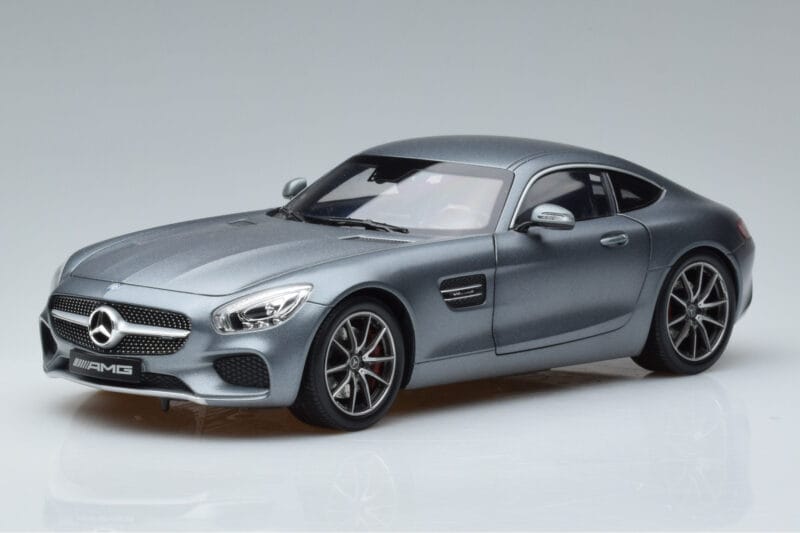The Mercedes AMG GT S Selenite Šedý Magno Norev 1:18 is crafted from Kov. Die-cast zinc alloy body with detailed plastic parts, rubber tires, and high-quality paint finish. Die-cast models are known for their weight, durability, and realistic feel.