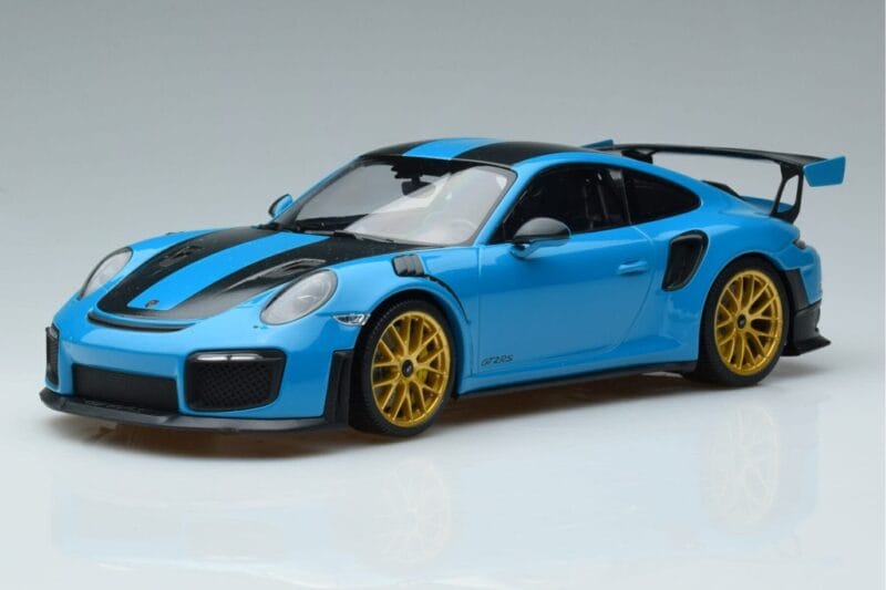 A 1:18 scale model measures approximately 25-28 cm (approximately 10-11 inches). The Porsche 911 991.2 GT3 RS Weissach Package Miami Modrý Zlatá Kola Minichamps 1:18 is perfect for display in a glass cabinet or on a shelf.