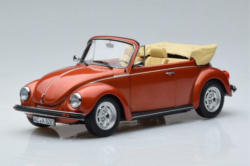 The Volkswagen Beetle 1303 Kabriolet Oranžový Norev 1:18 is crafted from Kov. Die-cast zinc alloy body with detailed plastic parts, rubber tires, and high-quality paint finish. Die-cast models are known for their weight, durability, and realistic feel.